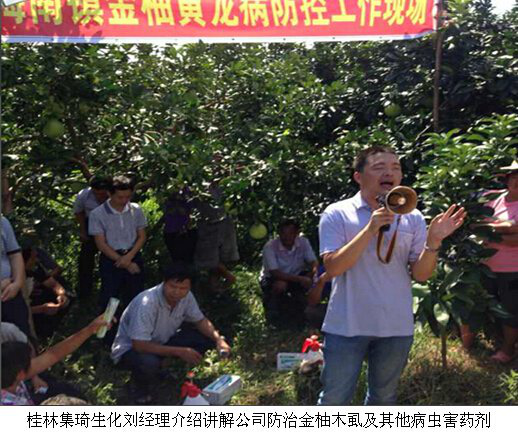 2014年8月25日,桂林集琦生化有限公司廣東片區(qū)劉文靜業(yè)務(wù)經(jīng)理參加了廣東梅州市農(nóng)業(yè)局組織的“梅南鎮(zhèn)金柚黃龍病防控現(xiàn)場(chǎng)會(huì)”。此次防控現(xiàn)場(chǎng)會(huì)到會(huì)種植大戶70多人,會(huì)議現(xiàn)場(chǎng),農(nóng)業(yè)局植保站溫康林站長(zhǎng)以預(yù)防金柚木虱為重點(diǎn)的黃龍病綜合防治技術(shù)、金柚主要病蟲害防治要點(diǎn)、金柚水肥及栽培管理技術(shù)三個(gè)方面為廣大種植戶進(jìn)行詳細(xì)的講解;劉經(jīng)理在會(huì)議上介紹了集琦生化公司防治金柚木虱及其他病蟲害藥劑。在現(xiàn)場(chǎng)會(huì)上農(nóng)戶聽課認(rèn)真,提問積極。通過此次大會(huì),一是加強(qiáng)農(nóng)戶對(duì)金柚黃龍病的認(rèn)識(shí),做到提前預(yù)防金柚黃龍病避免損失的發(fā)生;二是提高了集琦生化有限公司的品牌形象,為公司今后在該地區(qū)的銷售打下良好基礎(chǔ)。