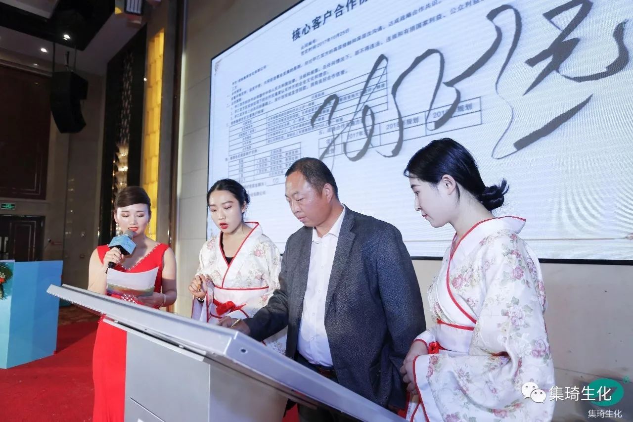 儀式首先由集琦銷售部長石志兵宣讀集琦生化戰(zhàn)略合作協(xié)議及抽獎政策,隨后,會上50多位客戶依次上臺簽約,與桂林集琦達成2018年度戰(zhàn)略合作協(xié)議。本次簽約與抽獎環(huán)節(jié)新穎時尚,平板機簽約,與科技接軌,搖號機抽獎,確保公平、公正和公開。
