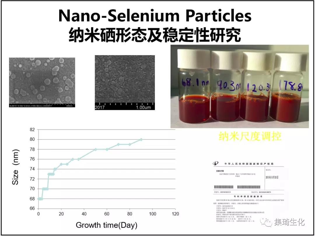 選用組合微生物菌種高效轉(zhuǎn)化無機硒為紅色活性納米硒。培育的菌種安全有效,孵育過程中可耐受高濃度無機鹽。紅色納米硒生理活性強,抗氧化性和可吸收利用性強。在生物功效方面,納米硒體外清除羥基自由基的效率為無機硒和普通有機硒的數(shù)倍,其毒性卻比無機硒和有機硒低數(shù)十倍。本品研發(fā)的生物納米硒形態(tài)均勻、規(guī)則,耐高溫和各種酸堿環(huán)境,不易轉(zhuǎn)化成黑色或褐色的低效納米硒。還通過各種條件篩選,選育出復合生態(tài)菌群(特定的芽孢桿菌和酵母菌、乳酸菌等),采用液體生物有機肥的生產(chǎn)工藝,以富含蛋白質(zhì)的底物作為主要原料,通過微生物的發(fā)酵,生產(chǎn)出富含多種活性生物酶、氨基酸、小肽、微量元素和有機質(zhì)等營養(yǎng)元素的產(chǎn)品。