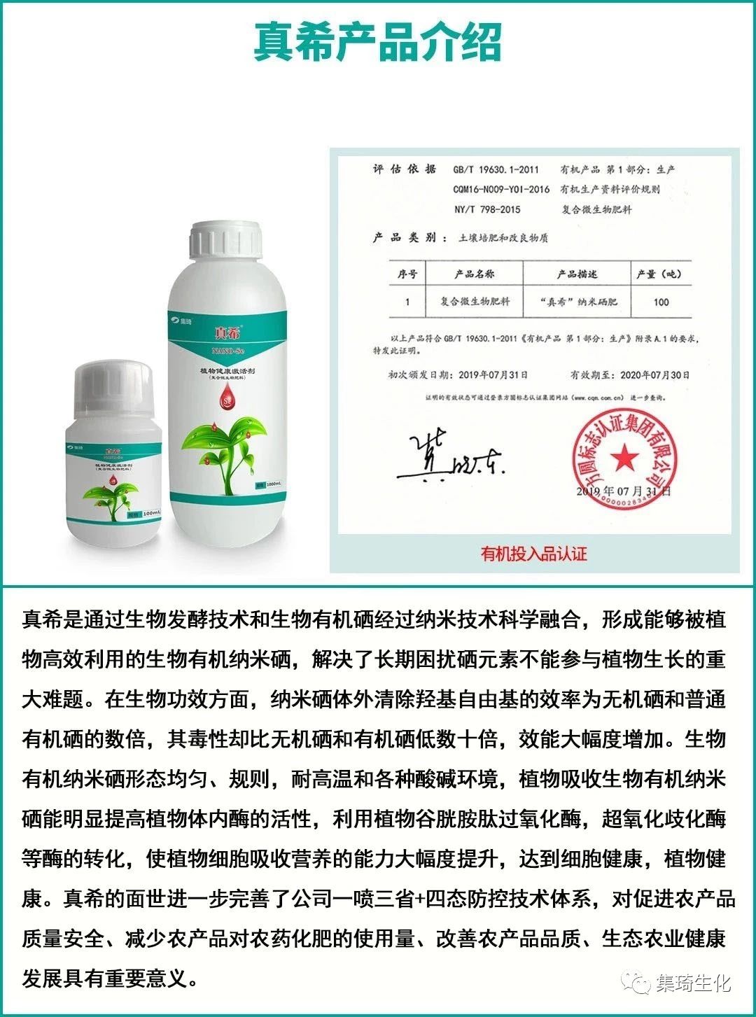 2019年桂林集琦生化有限公司引進(jìn)中國(guó)農(nóng)業(yè)大學(xué)潘燦平教授富硒專利技術(shù),聯(lián)合開(kāi)發(fā)出適合作物應(yīng)用的高科技富硒產(chǎn)品“真?!薄R唤?jīng)推出即受到了廣泛的關(guān)注?!罢嫦!钡闹饕煞稚锛{米硒作為植物健康的激活劑,具有提高植物體內(nèi)生物酶的活性,增加作物的抗性,促進(jìn)植物健康生長(zhǎng)等特點(diǎn)。“真?!弊陨鲜泻笤谌珖?guó)各地實(shí)現(xiàn)了在谷物、蔬菜、茶葉、水果等多種不同作物上的富硒。